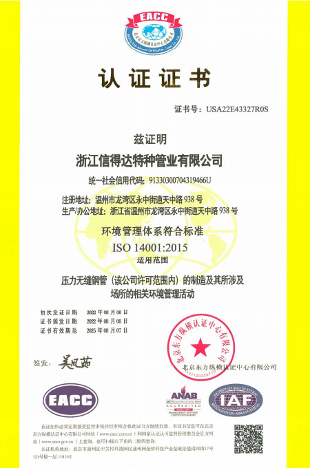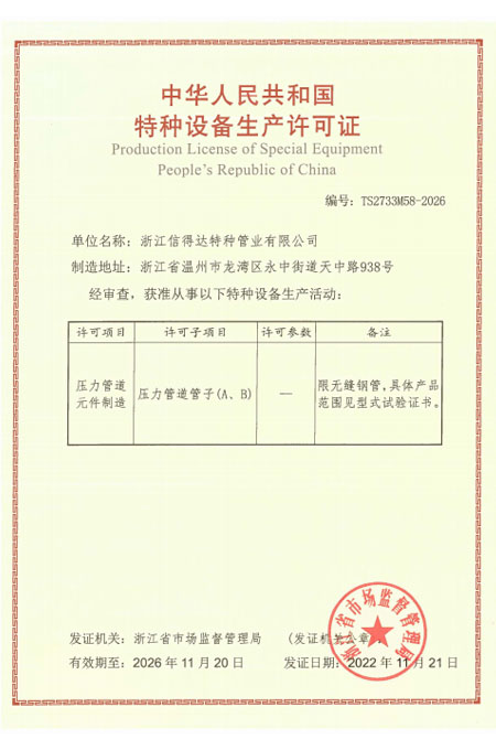 公司已全面通過了ISO9001:2008質(zhì)量管理體系認(rèn)證、14000環(huán)境管理體系認(rèn)證、18000職業(yè)健康管理體系認(rèn)證、國家質(zhì)量檢驗(yàn)檢疫總局A2-B類壓力管道元件制造許可、 歐盟PED認(rèn)證及德國AD-2000產(chǎn)品強(qiáng)制認(rèn)證、美國ASME材料產(chǎn)品認(rèn)證、信得達(dá)擁有1條穿孔生產(chǎn)線,10條冷拔生產(chǎn)線8條冷軋?zhí)胤N無縫鋼管生產(chǎn)線。